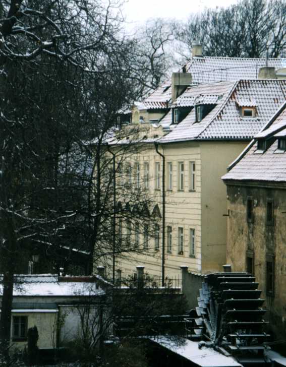 The frozen water wheel of the Grand Priory Mill on the Certovka (Devil's Stream) which separates Mala Strana from Kampa Island.