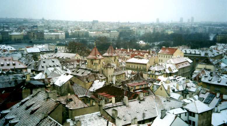 Roof tops of Mala Strana under a light cover of snow.